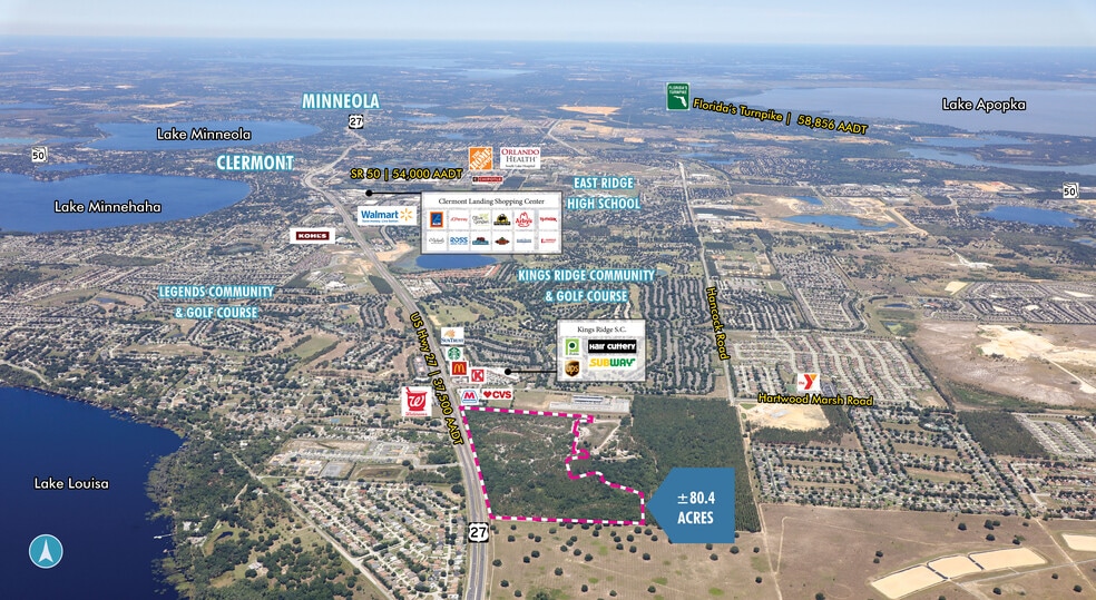 This unique development opportunity is located in Clermont, Florida on U.S. Hwy 27 at the Hartwood Marsh Road intersection. With over 2500 ft of frontage, the site is easily accessible to SR 50, the Florida Turnpike, and three approved roads connecting U.S. Hwy 27 to SR 429. The New Independence Parkway will connect to U.S. 27 just 1 mile south of the property and provide direct access to SR429 and the Horizon West Hamlin Town Center. Hamlin is the third fastest growing master-planned development in the U.S. The Lake/Orange County Connector is located 2 miles south of the property and will provide easy access to SR 429, Walt Disney World, Universal Studios, and Downtown Orlando. The property is ideally located adjacent to Publix, Walgreens, CVS, and McDonald’s, and in close proximity to a Walmart Supercenter, Aldi, JCPenney, and World of Beer. The fully approved PUD for commercial and residential use provides an excellent opportunity for future investment or development.