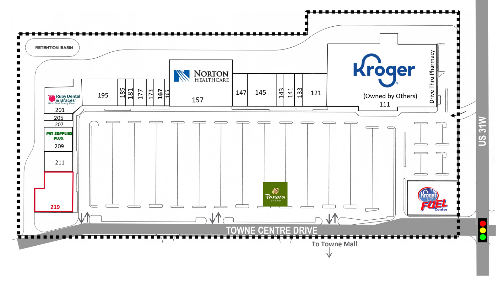 NAI Isaac is pleased to present Towne Centre, a community shopping center with a GLA of +/-173,044 SF, is situated on the west side of US 31 (North Dixie Avenue). The center is anchored by Kroger (60,727 SF) andNorton Healthcare (25,263 SF); Other retailers include Pet Supplies Plus, Jersey Mike's Subs and Sally Beauty Supply. Towne Centre is adjacent to Towne Mall, a 340,000 SF regional mall anchored by Belk, Burke's Outlet and JCPenney. Mall Park, a power center is just north of Towne Centre, anchored by Barnes & Noble, T.J. Maxx, Ross Dress For Less, Old Navy and Michaels. An At Home, Staples anchored center is located directly across US 31W. Also in the immediate area are Walmart Supercenter, Lowe's, Target, Home Depot, Academy Sports, Hobby Lobby, Sam’s Club and Menard's. The annual average daily traffic count in Elizabethtown is on US 31W near Towne Centre: +/-35,048 (‘18). The Elizabethtown Sports Park, 150-acres, has 12 baseball and softball diamonds, 10 natural turf soccer and football fields, 2 full-size synthetic turf fields and draws an estimated 57,000 visitors annually from 35 states. Elizabethtown is the county seat of Hardin County and is located at the intersection of three major highways: I-65, Bluegrass Pkwy and the Western KY Pkwy. Fort Knox Military Reservation, the sixth largest urban community in KY, is 15 miles north of the center and has nearly 400,000 visitors annually. Primary access to Towne Centre is a 2 lane dedicated entrance drive between Towne Centre & Towne Mall (Towne Centre Dr.) which connects to US 31W. The traffic signal at this intersection makes access quick and easy for employees & customers.