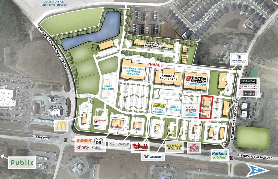 #1 retail location in the Hwy. 52 growth corridor. 23,300 VPD. Berkeley County is one of the top 100 fastest-growing counties in the US. Signalized intersection. 2,400 + homes in Foxbank Plantation. New $60M industrial facility across from site. BTS and lease opportunities. Adjacent to new school and fire station. 300+ planned multifamily units. Foxbank Towne Center is at the heart of Foxbank Plantation, an 800-acre, 2,400-home master-planned community in thriving Berkeley County, SC. Foxbank Towne Center provides a village area with a mix of potential commercial uses including a grocery store, drug store, offices, and retail. Strategically located to serve Foxbank Plantation, surrounding residential developments and the rapidly growing cities of moncks corner and goose creek, Foxbank Towne Center is poised to become the area’s central location for work, play and shopping.