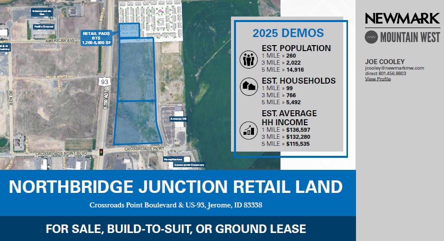 30.47 total acre parcels Sale, Build-to-Suit or Ground Lease High-visibility frontage on US-93 with signalized intersection, next to major truck stops Ideal for fast food, gas stations, or hospitality Direct access off I-84 exit 173 (north side)