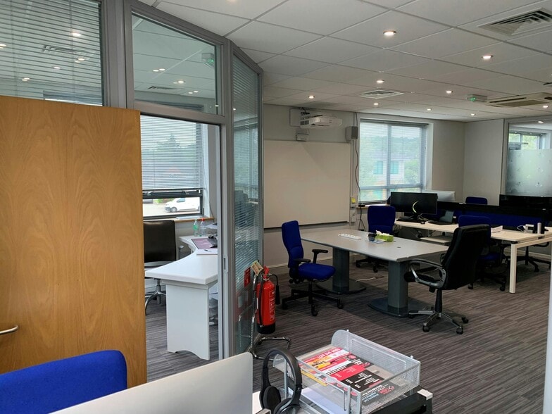 Unit M is a self-contained use class E property that comprises a ground and first-floor offices. The ground floor benefits from a reception area, one meeting room, a kitchenette and an open area which can accommodate approximately 6 working stations. There are suspended ceilings with CAT II lighting and an air conditioning unit. One WC is located in the corridor outside the ground-floor suite. The first floor has a meeting room, a small partitioned office, and a kitchenette, with the remaining space being open plan. The first floor has floor boxes and spotlights.