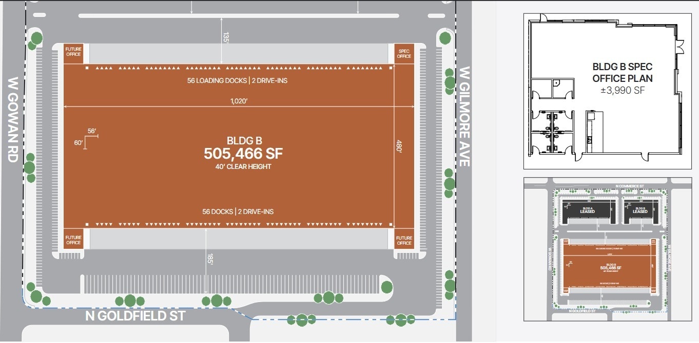Desert Willow Logistics Center – Building B is a ±505,466-square-foot, Class A industrial development located at 110 W Gowan Rd, North Las Vegas, NV. Designed to accommodate a wide range of user needs, the facility offers divisibility options, 40' clear height, and a cross-dock loading configuration featuring 112 dock-high doors and 4 drive-in doors. Additional specifications include LED lighting, 8-inch floor slab, and up to 3,250 amps of 277/480-volt, 3-phase heavy power. The truck court depth ranges from 135' to 185', and the property supports efficient logistics operations with 78 dedicated trailer parking stalls. Strategically positioned in the highly sought-after North Las Vegas submarket, the property sits at the northeast corner of N Commerce St and W Gowan Rd, offering immediate access to I-15 via the Cheyenne Avenue interchange. It is surrounded by abundant amenities and a strong base of quality tenants. Just 9.5 miles from the Las Vegas Strip and 13.5 miles from Harry Reid International Airport, the location offers exceptional connectivity to key business and transportation hubs.