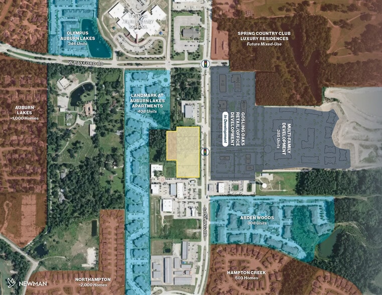 Retail pad sites available for ground lease or build-to-suit at the signalized intersection of Gosling Road and W Rayford Road in Spring, Texas. The offering includes four divisible pads totaling ±3.36 acres positioned along Gosling Road with excellent visibility and direct access to one of the primary north–south corridors connecting Spring and The Woodlands. Located directly across from the planned 50-acre Gosling Oaks mixed-use development, the site will benefit from new retail, restaurant, office, and Class A multifamily density. Strong surrounding demographics and proximity to Grand Parkway (SH 99), I-45, and major employment centers support long-term commercial demand along the corridor.