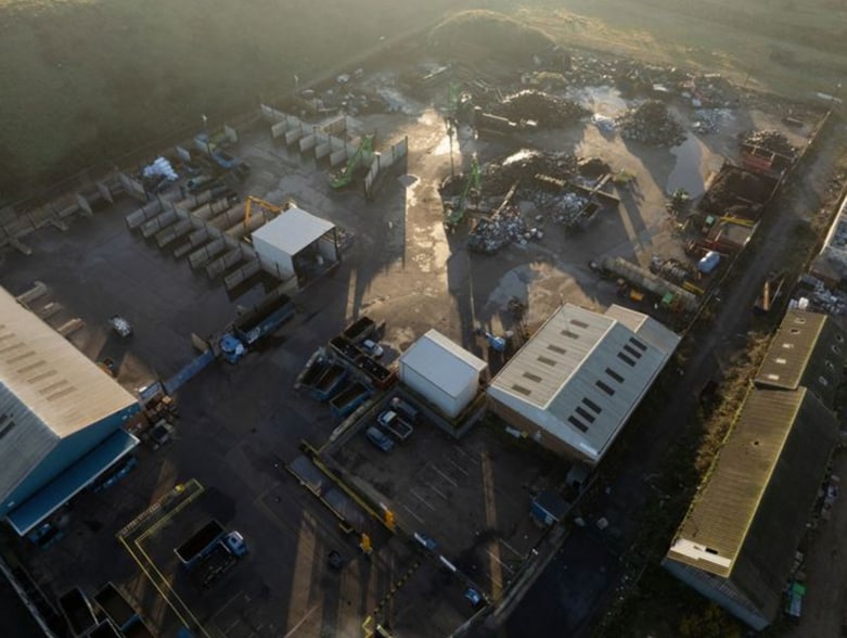 Set on a substantial 5.40-acre fully concreted and securely fenced site, the property presents a robust industrial compound made up of multiple buildings and operational structures. A two-storey office building sits alongside a large garage, a detached warehouse, and open-fronted storage units, all arranged around extensive hardstanding areas suitable for heavy vehicles, plant, and bulk materials. The site’s palisade perimeter fencing, broad circulation space and practical layout give it a strong industrial presence, well suited to engineering, logistics or storage-driven operations.