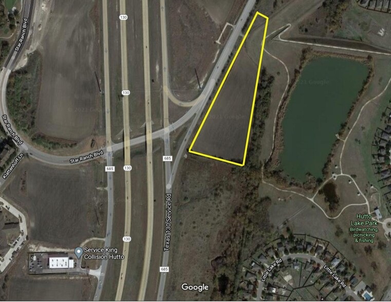 Rare 11,4 acres sans zonage et environ 1265 pi de façade de route. Accès facile et visibilité à partir du péage 130. Il borde le parc de la ville de Hutto. Manville water et collaboration avec la ville sur les égouts. Dans le MUD Star Ranch. Lac derrière la propriété à l'est.