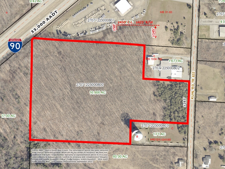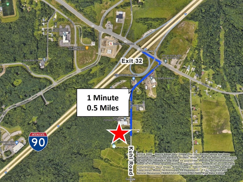 Site de développement de 18 046 ± acres juste à côté de l'I-90, sortie 32 (Wesleyville/route 430). Situé près de Penn State Behrend, commerce de détail, industrie légère et nouveaux développements. Façades d'environ 426 pieds le long du chemin Kuhl. Visibilité sur l'autoroute avec une façade de ±40 pi le long de l'I-90 en direction est. 32 000 véhicules quotidiens moyens le long de l'I-90 (PennDot 2022 AADT). Eau publique disponible. Zoné B-2 (quartier des affaires de l'échangeur). Le zonage permet les hôtels, les restaurants, les restaurants en voiture, les parcs de véhicules routiers, les services automobiles, le commerce de détail, l'industrie légère, les installations d'entreposage, les vendes/services de camions et d'équipement lourd, les parcs éoliens et plus encore. Enquête disponible.