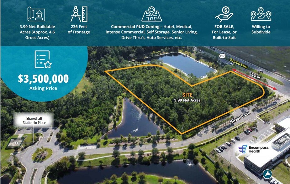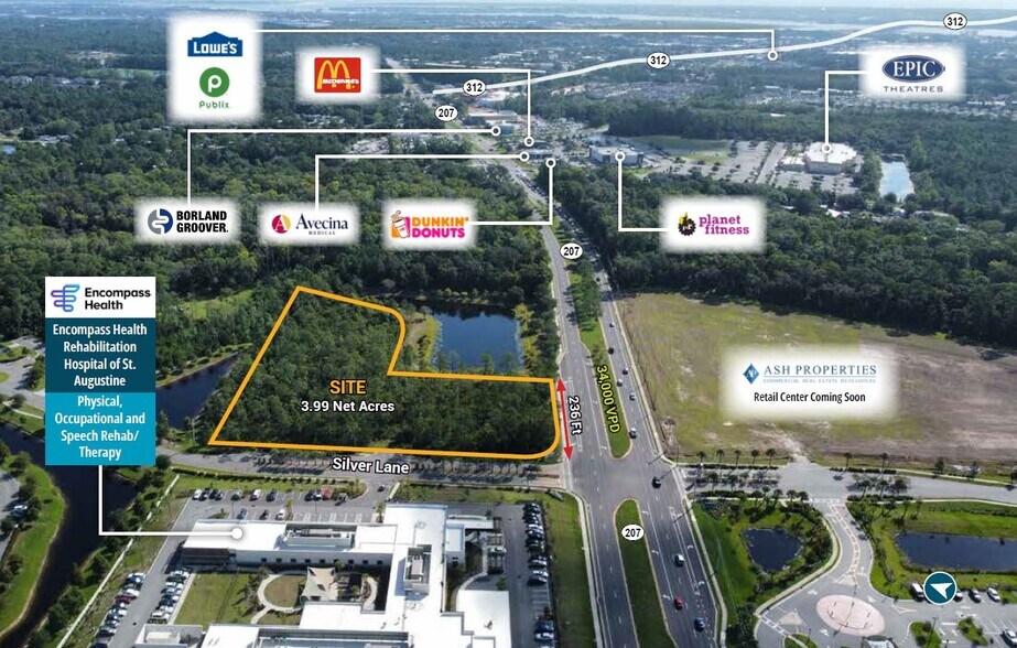 Volume de trafic : 34 000 véhicules par jour (VPD) Façades : 236 pieds le long de la SR 207 Développements à proximité : Un centre de vente au détail sera bientôt disponible Communauté résidentielle de Deerfield Preserve