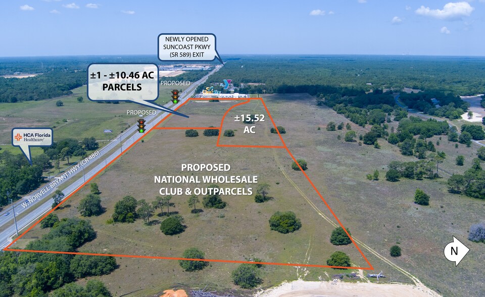 ±1 AC to ±11 AC parcels and ±15.52 AC available for anchor, junior anchor, and outparcel users. Up to 37 acres available. Retail, medical, hospitality, and office uses welcome. Approximately 1.5 miles from the new Suncoast Parkway exit (2026 completion). Conveniently located in Citrus County just minutes from the Black Diamond Ranch, Citrus Hills, and Pine Ridge developments. Nearby retailers include Walmart, Target, Hobby Lobby, Aldi, PetSmart, Mavis Tire & Brakes, Caliber Car Wash, McDonald's, Wendy's, Wawa, Culver's, Tidal Wave Auto Spa, Panda Express, Glory Days Grill, Panera, 7-Eleven, Texas Roadhouse, and Starbucks. Proposed area retailers include Sprouts Farmers Market, Five Below, Ulta Beauty, Dollar Tree, Planet Fitness, America's Best Eyeglasses, Express Oil Change & Tire Engineers, KFC, AT&T, Chipotle, Five Guys, Firehouse Subs, Arby's, Skechers, Take 5 Oil Change, Florida Credit Union, and Quick Care Med.