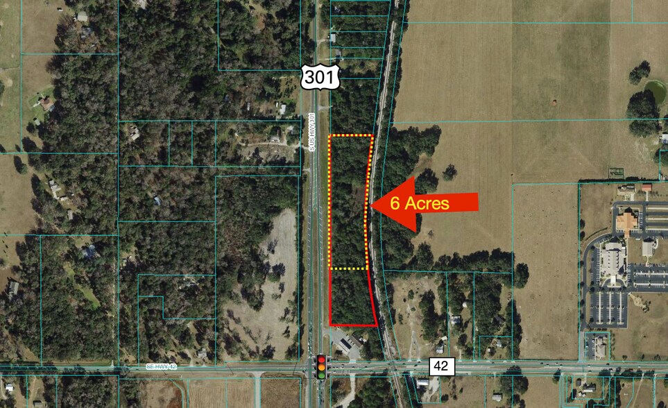 Incroyable opportunité de développement sur 6 acres avec 950 pieds (+/-) de façade d'autoroute ! La propriété a 4 acres zonés M1 et 2 acres A1. Situé à moins d'un mile de The Villages avec accès possible à partir du coin signalisé très fréquenté de la route 42. Pratique pour les autoroutes I-75 et Florida Turnpike. Située dans le comté de Marion, numéro de parcelle 48378-000-00, la parcelle nord de 6 acres en cause d'environ 8 acres est disponible. L'AADT est de 17 500 voyages par jour/route 301 américaine, 13 500 voyages par jour/SE Hwy 42 (FDOT-2024).