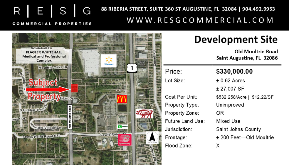 Site de développement sur le chemin Old Moultrie à St. Augustine, en Floride Ce site est d'environ 0,62 acre combiné et offre une façade de +/- 200 pieds sur le chemin Old Moultrie. Le zonage actuel est OR (Open Rural) est un district à usage mixte.