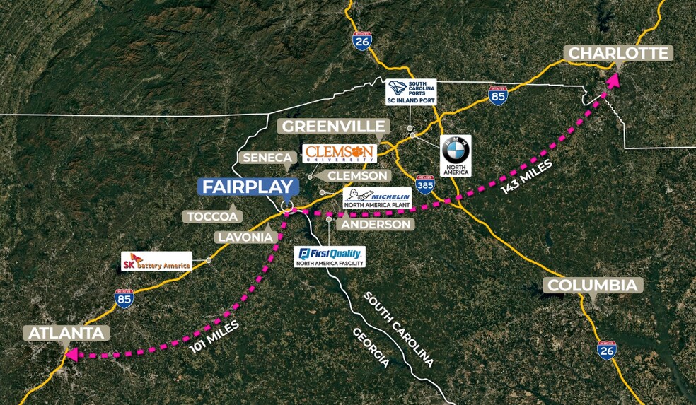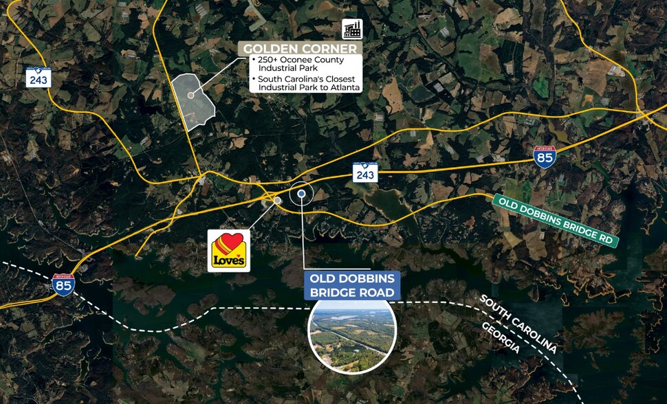 Située à moins de 3 milles du parc commercial Golden Corner du comté d'Oconee, un parc industriel appartenant au comté comptant plus de 260 acres constructibles, cette propriété se trouve dans l'un des corridors de croissance les plus dynamiques du Sud-Est. Golden Corner Commerce Park est le site industriel de Caroline du Sud le plus proche d'Atlanta, ce qui en fait un emplacement clé pour la logistique et l'industrie.