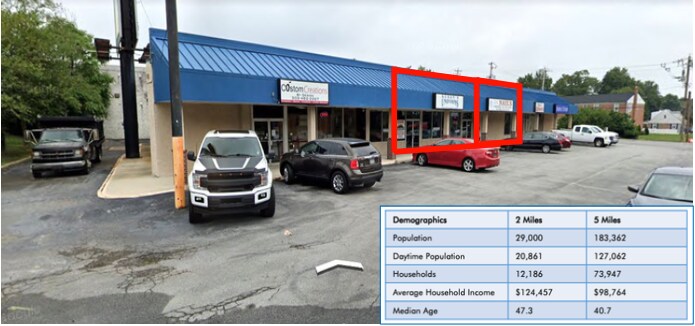 Des unités de vente au détail très visibles à Murphy Road Plaza, un centre de vente au détail bien établi au coin du chemin Murphy et de la route 202. Les espaces doivent être loués séparément ou combinés pour un total de 3 050 SF. Dénombrements de circulation : 18 000 VPD (chemin Murphy) et 53 000 VPD (Concord Pike). Près de l'I-95 Nord/Sud. Revenu médian moyen des ménages : 163 000$