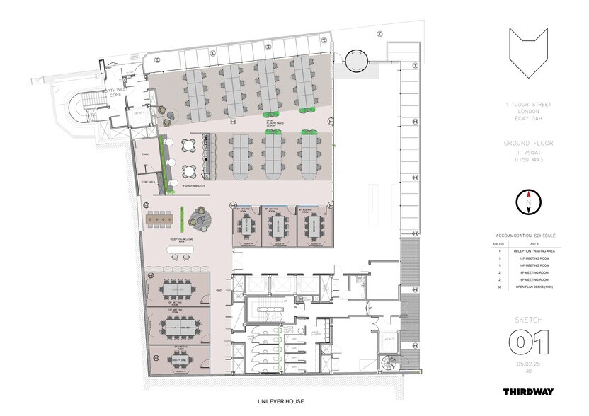 Le 1, rue Tudor est situé près de la rivière et à environ 100 m de la station Blackfriars. La cathédrale St Pauls et la place Paternoster se trouvent à une courte distance de marche. Le transport local comprend les services souterrains Blackfriars et St Pauls, City Thameslink, National Rail et Crossrail.