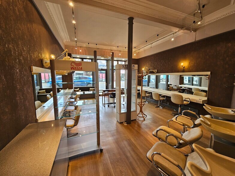 La propriété fait partie d'un immeuble traditionnel, offrant un espace de vente au détail au rez-de-chaussée et un espace de stockage au sous-sol avec des vitrines en aluminium à double vitrage et un accès piétonnier vitré. À l'intérieur, le local a été aménagé pour servir de salon de coiffure, mais il convient à une variété d'usages. Le local présente des corniches traditionnelles, avec des murs et un plafond en plâtre/peints et un plancher en bois. Un éclairage par spots a été installé et le chauffage est assuré par des radiateurs électriques, avec un système séparé pour fournir de l'eau chaude aux stations de lavage des cheveux. Un WC unique est situé à l'arrière du local.