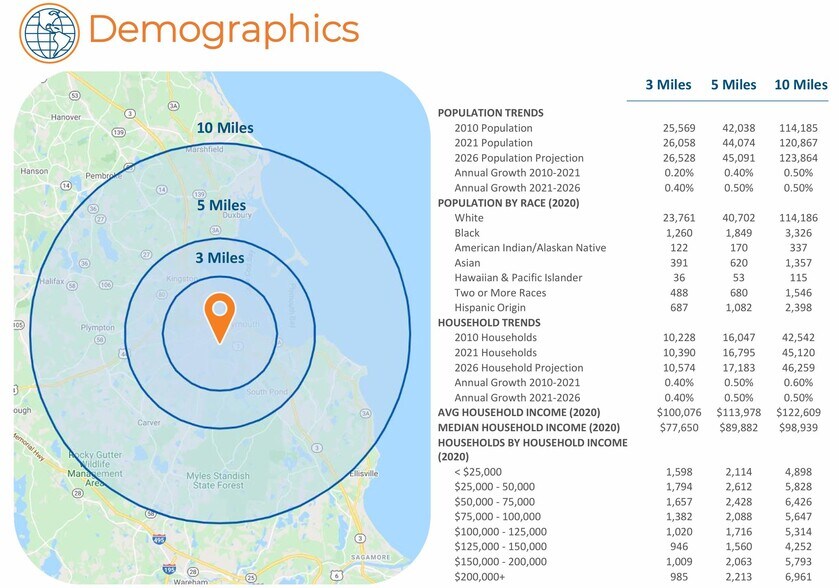 The Pilgrim Hill Plaza is ideally located in the South Shore, an affluent community that is only thirty minutes south of Boston. The site also benefits from its prime location just miles from the historic Plymouth Bay shores, in Plymouth Massachusetts. The subject investment property is situated on Pilgrim Hill Road just off Samoset Street, which has an average daily traffic count of 32,750 vehicles. Samoset Street serves as an access road to Pilgrim’s Highway, which brings an additional 87,450 vehicles into the immediate area on average daily. There are more than 44,000 individuals residing within a five-mile radius of the property and more than 120,800 individuals within a ten-mile radius. Additionally, the subject property is situated in an extremely affluent community. The average income within a ten- mile radius is greater than $122,600, which is double the national average. The Pilgrim Hill Plaza is located in a major retail cluster with dozens of national and local tenants, medical facilities, and shopping centers all within close proximity of this property. Major national tenants include: CVS, Walgreens, Stop & Shop, Staples, Pet Supplies Plus, Starbucks, McDonald’s, Burger King and many more. This property is located three miles from the Beth Israel Deaconess Hospital, a 168-bed acute care community hospital and medical facility that serves residents from over 12 towns in the Plymouth and Barnstable counties. Other medical facilities nearby include: Plymouth Rehabilitation & Health Care Center, Plymouth Harborside HealthCare, Stafford Hill Assisted Living, in addition to various others. Also, the subject property is located within walking distance to the Plymouth Cultural District where tourists flock to, either for a walk in the Nelson Memorial Park, a Visit to the Pilgrim Hall Museum, or to see the historic Plymouth Rock where the Mayflower touched down in the Americas. Plymouth is a town in and one of the county seats of Plymouth County, Massachusetts. Plymouth holds a great prominence in American history as it was where the Mayflower Pilgrims touched down in the early 1600s. It is located on the Southeastern Shore of Massachusetts and continues to act as an active port for the fishing economy of New England, yet today, the economy is primarily driven by tourism. The Pilgrim Hall Museum, located in Plymouth is the oldest operating museum in the United States. The largest employer in the town is the Beth Israel Deaconess Medical Center. Other major employment sectors include Tourism and Scientific Research.