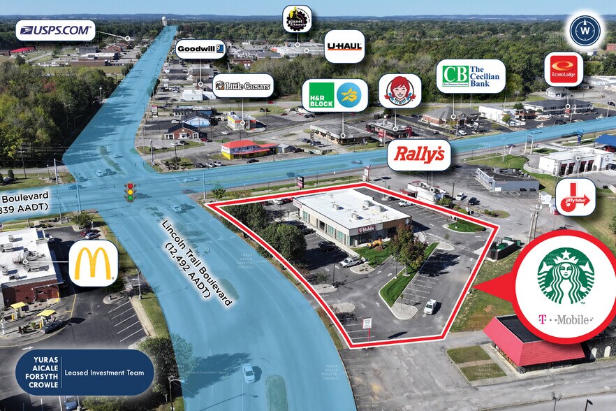 Situé dans un coin à signalisation dure dans un couloir de détail dense avec un comptage combiné de plus de 43 000 véhicules par jour devant le site, et immédiatement en face de Radcliff Square (centre commercial de 150 000 pieds carrés). 1,5 milles de Fort Knox (plus de 22 000 employés et plus de 13 000 emplois indirects) avec un impact économique de 5 milliards de dollars. À proximité de la nouvelle usine de batteries électriques Ford de 5,8 milliards de dollars, qui créera plus de 5 000 emplois.