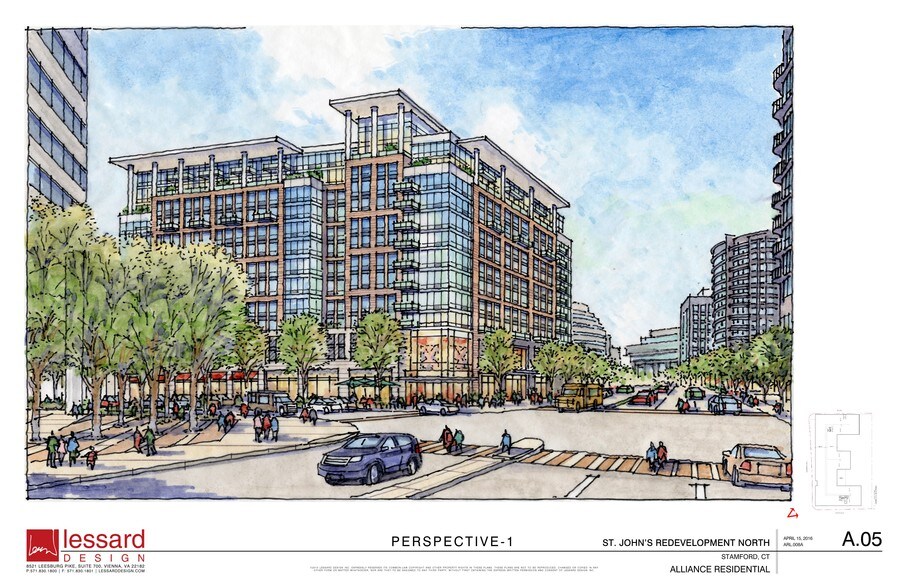 Ce complexe de luxe à usage mixte offre une visibilité extraordinaire sur le boulevard Washington à un coin bien en vue, rue Main et Main, au centre-ville de Stamford. Plus de 1 000 unités résidentielles sont situées dans un rayon d'un pâté de maisons et la zone commerciale immédiate comprend 11 millions de pieds carrés de bureaux, 2 000 chambres d'hôtel et 7 500 unités résidentielles.