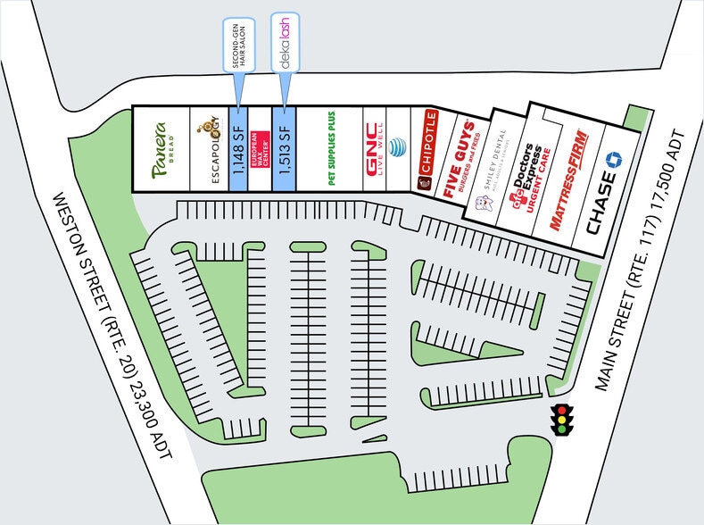 - 44,639 SF shopping center with frontage on both Main Street (Rte. 117) and Weston Street (Rte. 20)