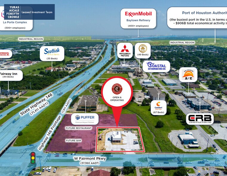 The property is strategically located at the hard corner of Highway 146 Frontage and W Fairmont Parkway, with excellent visibility and access to 37,000 vehicles per day directly in front of the property. W Fairmont Parkway provides immediate access to Highway 146 (71,411 AADT), which in turn connects to Highway 225 (90,659 AADT) just north of the property. Additionally, the property is supported by an affluent customer base, with an average household income of $135,889 within a three-mile radius. Positioned along the area’s major retail corridor, the property is near several notable retailers, including Kroger, Starbucks, AT&T, Anytime Fitness, Denny’s, and many others. The property is ideally located near major industrial employers such as LyondellBasell (800+ employees), ExxonMobil (400+ employees), and the Port of Houston (the busiest port in the U.S. in terms of tonnage). This Chipotle has beneficial proximity to San Jacinto College: Central Campus (15,000+ students) as well as many La Porte Independent School District schools,