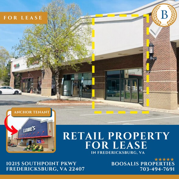Retail space available at 10215 Southpoint Parkway in Fredericksburg, VA, located within Southpoint Shoppes II, a well-positioned shopping center along Southpoint Parkway at I-95 Exit 126. This 1,400 SF space is situated in a Lowe’s-anchored center within one of Virginia’s fastest-growing retail corridors. The suite offers a functional layout that includes a private office, waiting area, large common room, one ADA-compliant restroom, and ample parking, making it suitable for a variety of uses including medical office, salon, beauty services, or retail. The property is zoned C-3, allowing for flexible commercial use. Southpoint Shoppes II benefits from strong visibility and high traffic, with over 119,000 vehicles per day along nearby I-95. The property is located just minutes from Cosner’s Corner, the largest mixed-use development in Spotsylvania County, featuring more than 90 national and regional retailers including Target, Publix, Marshalls, Ross, and Kohl’s, attracting significant daily consumer traffic. This location provides excellent access to major transportation routes and is surrounded by a growing residential population and established retail destinations, offering a strong customer base for businesses seeking to establish or expand in the Fredericksburg market.