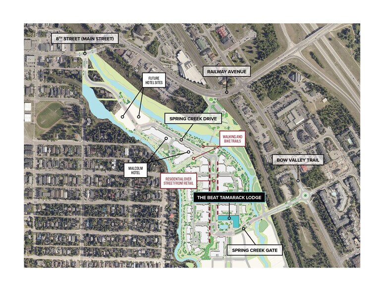 Le beat partage un espace commun extérieur — un aspect déterminant à l'arrivée à mesure que la circulation entre par la porte d'entrée du ruisseau de printemps et traverse le battement jusqu'à chaque extrémité de la promenade spring creek. Conçue en gardant à l'esprit la convivialité des piétons, une voie à sens unique s'enroule autour du rythme, donnant accès aux utilisations commerciales le long de ses façades nord et est. Situé au centre, à quelques minutes du centre-ville de Canmore, cet espace spécial est situé dans les zones à haute densité de Canmore. Entouré de vues sur les montagnes, cette région est un lieu de choix pour les habitants et les visiteurs en raison de ses sentiers faciles à pied et à vélo. La région dispose d'une rue achalandée et facile à circuler pour l'accès aux véhicules.