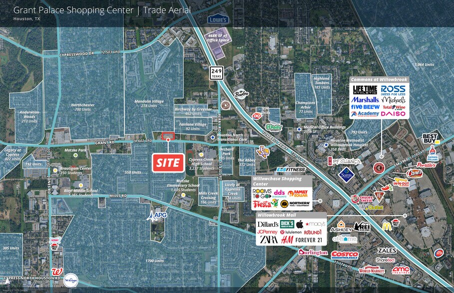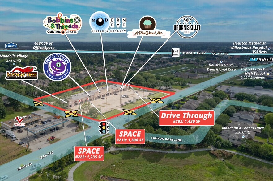 VPD: 18,602 Submarket: Willowbrook / Cy-Creek with direct access to SH 249 & Beltway 8 Nearby Development: 462-unit Greystar apartment community (Birchway Perry Road) Proximity: Directly across from Cypress Creek High School (3,239 students) and minutes from Houston Methodist Willowbrook Hospital (358 beds) and St. Luke’s Health Nearby Retail: Recently opened EOS Fitness driving consistent daily traffic Parking: 123 spaces (high parking ratio)
