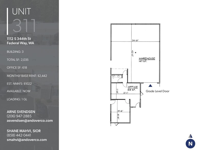 BUILDING: 2 Total SF: 2,064 OFFICE SF: 579 MONTHLY BASE RENT: $2,477 EST. NNN’S: $1,036 AVAILABLE: NOW LOADING: 1 GL