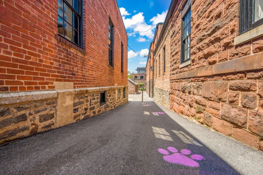 Aire de réception, grands bureaux privés ouverts avec feux de verre, salle de conférence vitrée, salle de travail, placard de rangement et kitchenette. Espace au 1er étage dans un entrepôt rénové avec grandes fenêtres de style industriel, hauts plafonds apparents et pierres apparentes. Entrée d'espace supplémentaire sur Cady's Alley.