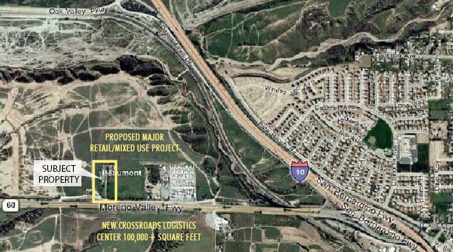 Vacant land (unimproved), Zoned Urban Village. 5 acres (rectangular, mostly flat and partially paved). Frontage on Hwy 60, situated just west of the I-10/Hwy 60 interchange and just east of the Potrero Blvd overcrossing—excellent for visibility and access. Urban Village plan—permitted uses include a wide range of commercial, office, light industrial, mixed-use, etc. (details available in supplement documents.