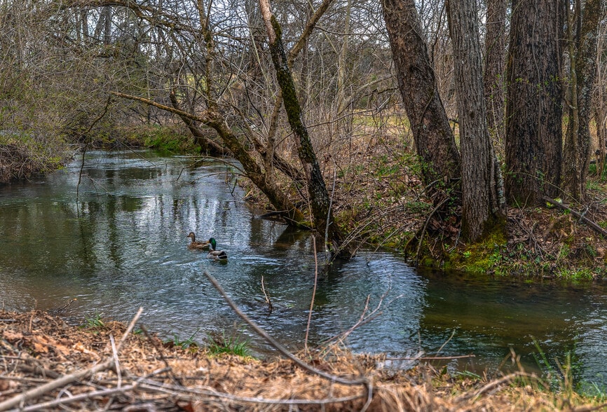 The property also features a creek along the rear boundary, creating a private, tree-lined area that offers a quiet natural setting for employees or tenants to enjoy. This unique feature adds to the overall appeal while maintaining the property’s commercial functionality.
