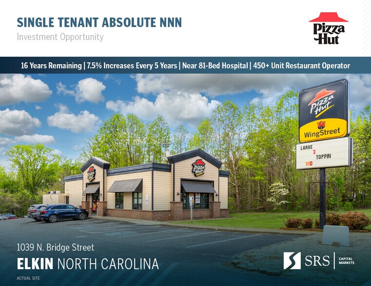 SRS National Net Lease is pleased to offer the opportunity to acquire the fee simple interest (land & building ownership) in an absolute NNN leased, Pizza Hut investment property located in Elkin, North Carolina. The tenant has approximately 16 years remaining on its initial lease term with 4 (5-Year) options to extend, demonstrating their commitment to the site. The lease features 7.50% rental increases every 5 years throughout the initial term and at the beginning of each option period, steadily growing NOI and hedging against inflation. The lease is absolute NNN with zero landlord responsibilities making it an ideal, management free investment opportunity for an out of state investor.