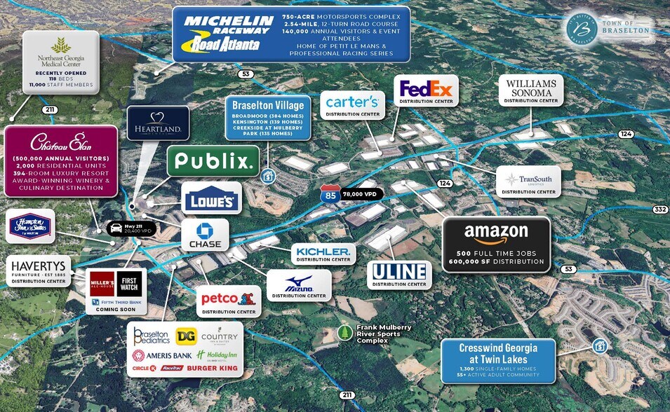 • Amazon recently opened an approximately 600,000 square foot distribution facility in Braselton, bringing more than 500 full time jobs to the trade area