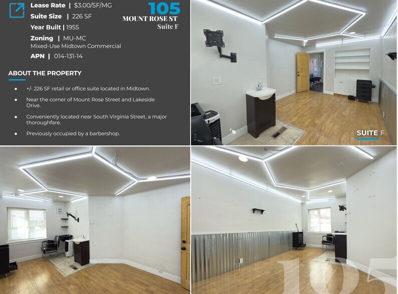 DCG is pleased to present 105 Mount Rose St Suite F now available for lease. This ±226 SF retail or office suite offers the perfect opportunity to establish your business in the heart of Midtown. The space features excellent visibility, convenient access, and a professional environment suited for a wide variety of uses.