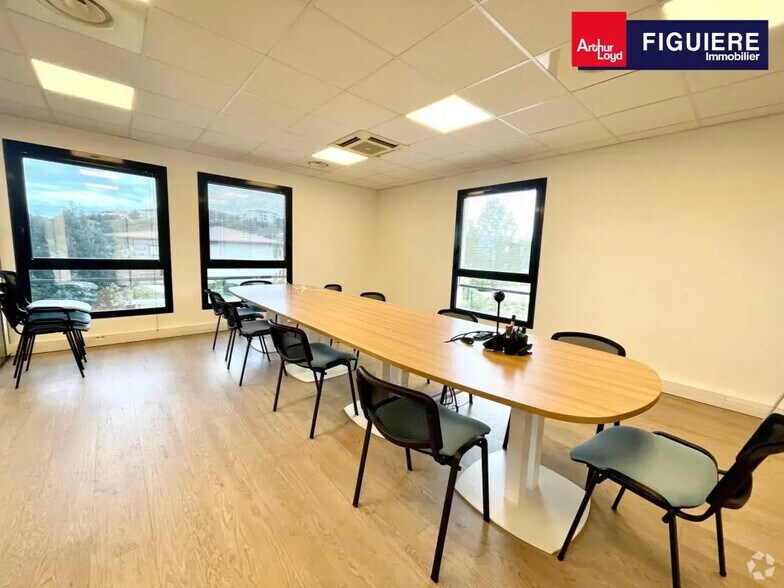 L’immeuble se situe dans la zone d’Aix La Duranne, un secteur calme et verdoyant offrant un environnement de travail agréable. Il bénéficie d’un accès rapide aux principaux axes routiers via la RD9 et les échangeurs autoroutiers à proximité. Les transports en commun sont facilement accessibles avec plusieurs lignes de bus desservant la zone et la gare TGV d’Aix à seulement quelques minutes. L’aéroport Marseille Provence est à 20 minutes, ce qui facilite les déplacements professionnels. Le site est sécurisé avec portail, digicode et éclairage extérieur, et propose des parkings paysagés ainsi que des bornes électriques pour véhicules.