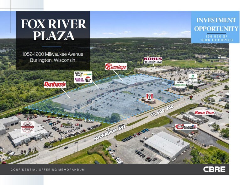 CBRE is pleased to offer a 100% fee simple opportunity to purchase Fox River Plaza which consists of a 169,520 square foot retail center along the Milwaukee Avenue corridor in Burlington. This fully leased property is anchored by Dunham’s Sporting Goods, Runnings Supply, and Planet Fitness.