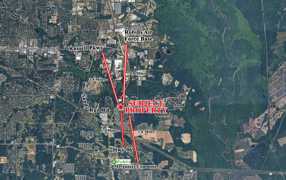 Minutes from Robins Air Force Base, Publix, and Hwy 96. Assembly Lane, which connects directly to the property, leads to Sandy Run Plaza (89 Sandy Run Road), and Landing Pointe Plaza. Nearby businesses include Hardee’s, Café Vignette, and a Chevron gas station — all contributing to steady daily traffic and built-in consumer activity.