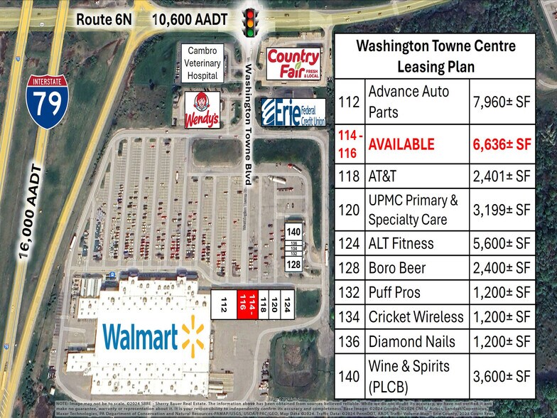 Espace mixte de 6 636 ± SF à louer au Washington Towne Centre. Situé juste à côté de l'I-79 à Edinboro, avec une excellente signalisation et une excellente visibilité. 11 000 véhicules quotidiens moyens le long de la route 6N et 15 000 véhicules quotidiens moyens le long de l'I-79 (PennDot AADT, année de comptage 2022). Rejoignez Walmart, Advance Auto Parts, AT&T, UPMC Primary & Specialty Care, ALT Fitness, Boro Beer, Puff Pros, Cricket Wireless, PA Fine Wine & Good Spirits et Diamond Nails. L'espace disponible comprend actuellement un plan d'étage ouvert avec salle arrière, toilettes ADA, salle de stockage, façade de fenêtre de 81 pi 3 po et plafonds de 11 pi. Plan d'étage et visite 3D disponibles. Se subdivise en 1 650 ± SF, 3 330 ± SF ou 4 980 ± SF. Zone C-1, Commercial District (canton de Washington), offrant de nombreuses utilisations possibles : commerce de détail, restaurant, banque, bureau et plus encore. Offert au prix de 13,00 $/SF/AN — NNN. Le NNN est estimé à 3,31 $/PF/an en fonction de 2023. Le locataire paie environ 9 019 $/mois (loyer de base + NNN) plus les services publics. Communiquez avec le courtier pour obtenir de plus amples renseignements ou pour planifier une visite guidée.