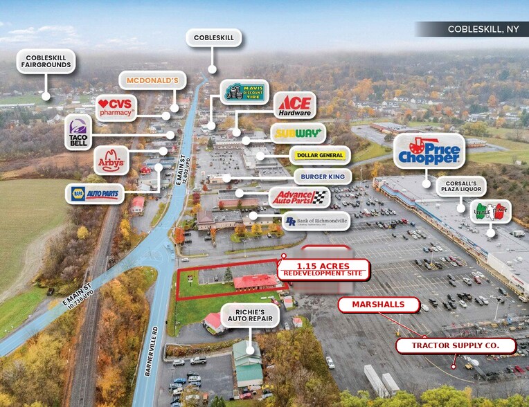 109 Barnerville Road, Cobleskill, NY offers a compelling pad site and redevelopment opportunity in the heart of Cobleskill’s dominant retail corridor. Positioned along one of the area’s primary commercial arteries, the property benefits from excellent visibility, strong accessibility, and direct proximity to an established cluster of national and regional retailers that serve both the local market and the surrounding rural trade area.