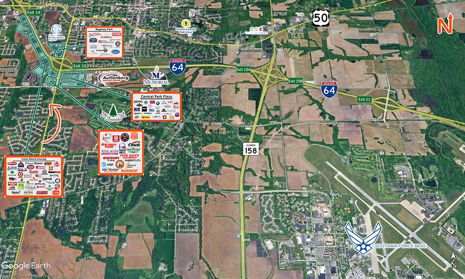 Located 1/2 Mile to I-64, exit 16 near the corner of N. Green Mount Rd and Frank Scott Parkway. Site is Near Target, Dierberg’s, Menard’s and the New Memorial & St. Elizabeth Hospitals.