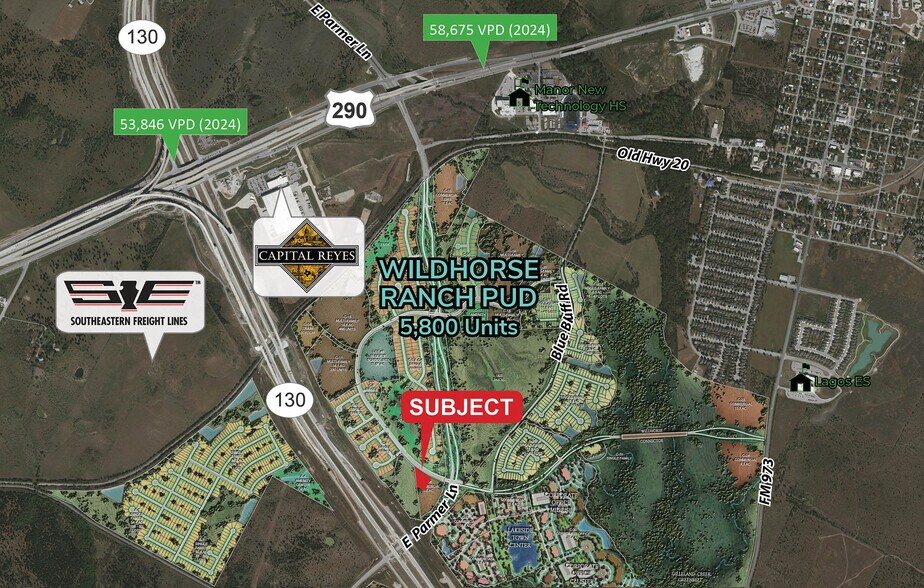 La propriété se trouve dans le Wildhorse Ranch PUD, une communauté résidentielle de plus de 1 800 acres actuellement en construction. La première phase de construction de plus de 300 maisons est en cours de construction immédiatement de l'autre côté de Parmer Lane. À la pleine construction, il y aura plus de 5 800 unités résidentielles. Le site sera livré avec des plaques, avec des services publics et un système de rétention hors site.