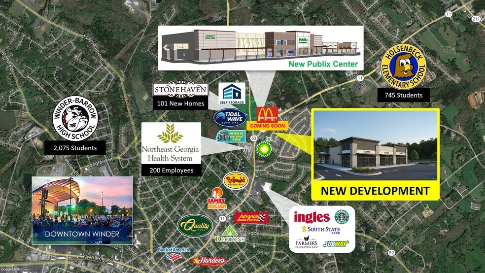 FOR LEASE: 5,950 SF New Strip Center development located at the intersection of Highway 11 (Jefferson Hwy) and Wisteria Drive in Winder, Georgia. The property is located across the street from the new Publix-anchored development, consisting of 9,000 square feet of small shop space that is fully leased, and a McDonald's coming soon. On the other side of Publix will be 101 Single-Family Homes, Mavis Discount Tire, Self Storage, and Tidal Wave Car Wash. Property is within walking distance from Northeast Georgia Medical Center, consisting of 200 doctors and staff.