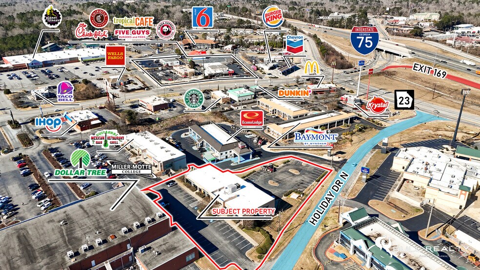 110 Holiday Drive is strategically located within North Macon’s Tom Hill retail corridor, one of the area’s strongest commercial nodes. The property benefits from immediate access to I-75 (Exit 169) and proximity to national retailers, restaurants, banking institutions, and service providers. The ±16,227 SF multi-tenant building offers flexible suite configurations and strong parking. Its professional exterior presence, multiple ingress/egress points, and accessible layout make it well-suited for office and medical users seeking visibility and convenience without premium pricing. Highlights - Located in North Macon, associable via Riverside Dr &/ or Tom Hill Sr. Boulevard - Convenient to I-75 exit 169, shopping centers, restaurants, & banks - Paved parking - Zoned C-2 (General Commercial District) - Landlord pays CAM, taxes, & insurance - Tenant pays Landlord monthly for water and trash Why North Macon? - Immediate access to I-75 - Dense retail and service corridor - Strong surrounding household income ($111,010 within 3 miles – from demographics page) - Established professional user base - Accessible via Macon Transit Route 5