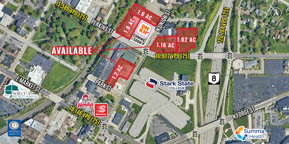 Disponibles : 1.35 CA et 1.16 AC construite pour convenir ou bail foncier Situé sur la rue Perkins, artère principale d'Akron, de la route d'État 8 au centre-ville d'Akron Le Stark State College est situé de l'autre côté de la rue Plus de 110 000 employés et 6 000 entreprises dans un rayon de 5 milles Emplacement régional avec accès au RS 8 GÉNÉRATRICES SUPÉRIEURES : -Stark State College - 11 833 étudiants -Summa Health System - 7 500 employés -Akron General - 7 000 employés -Université d'Akron - 4 000 employés et 25 000 étudiants -Hôpital pour enfants d'Akron - 3 700 employés -Gouvernement du comté de Summit - 3 000 employés -Canal Park - 340 000 visiteurs -Stade Infocus - salle de 30 000 places