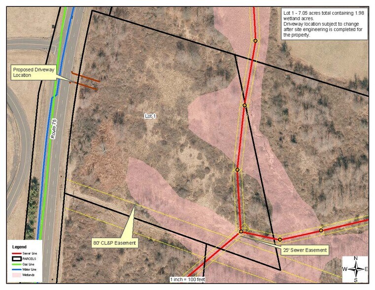 La Ville, récemment subdivisée, possédait un terrain à vendre. La topographie s'éloigne de la route jusqu'à une zone plate. Le plan conceptuel du site indique qu'un bâtiment pouvant contenir jusqu'à 25 750 SF, avec chargement et stationnement connexes, peut être aménagé sur le site.
