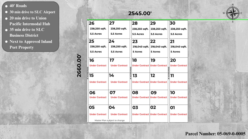 DESCRIPTION Ces 160 acres sont divisés en 30 lots et sont situés à proximité de S.I.T.L.A. EMPLACEMENT L'emplacement se trouve à seulement 35 minutes de l'aéroport international de Salt Lake et à trois minutes de l'autoroute I-80. ZONAGE La propriété est actuellement zonée MU-40 et est en cours de reclassement en M-D (Fabrication légère / Distribution). SERVICES Électricité, eau via un puits et système d'égout via une fosse septique sont disponibles. La propriété est en cours d'annexion à la ville de Grantsville, ce qui permettra d'avoir accès à l'eau et aux égouts municipaux.