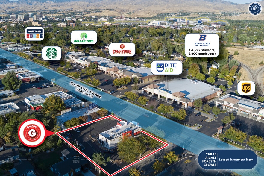 Emplacement à haute visibilité et facilement accessible le long de l'avenue South Vista, une importante artère nord-sud de Boise, avec accès à plus de 23 000 véhicules par jour directement devant le site. Entouré de locataires notables tels qu'Albertson's, McDonald's, Rite Aid, Starbucks, Jack in the Box, Dollar Tree, Cold Stone Creamery, Well Fargo, Jimmy John's et bien d'autres. Situé à moins d'un mile de la Boise State University, la plus grande université de l'Idaho, avec un total de plus de 26 000 étudiants inscrits au premier cycle. À proximité de plusieurs carrefours communautaires de Boise, dont Bowden Park, Terry Day Park, Boise State Indoor Tennis Center, Ann Morrison Baseball Fields, Boise Depot et plusieurs autres. Forte démographie, avec 184 067 résidents vivant dans un rayon de cinq milles du site. Revenu moyen des ménages aisés de 110 252$ dans un rayon de cinq milles autour de la propriété. La zone située dans un rayon de cinq milles autour du site a connu une augmentation de 17 % de la population depuis 2010. Le site est entouré de quartiers et de communautés densément peuplés, désignés sous le nom de quartier « Depot Bench », avec 2 023 maisons unifamiliales. Les augmentations prévues de l'AAHI et de la population dans des rayons de 1, 3 et 5 milles au cours des cinq prochaines années laissent Guthrie's et Boise connaître une croissance simultanée constante.