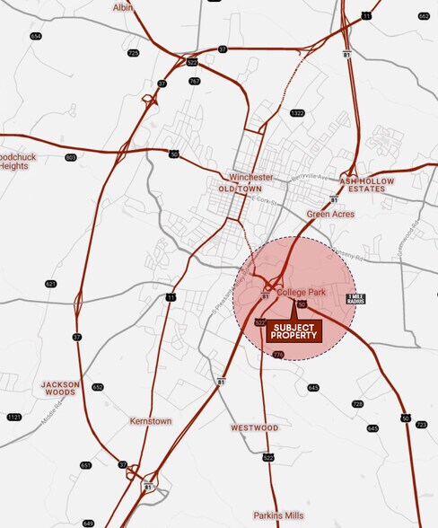 Parcelle très visible de 1,38 acre (200 pi de large x 300 pi de large) surplombant une zone de vente au détail diversifiée, y compris Costco. Un rapport géotechnique et la phase 1 environnementale sont disponibles ainsi qu'un relevé complet de l'ALTA. Carrefour commercial solide avec un mélange de magasins de détail, de restaurants et d'entreprises axées sur les services. Cette variété produit une vaste clientèle et génère un trafic quotidien vers la région immédiate. Le site est situé sur un brochet de Millwood très fréquenté avec un accès pratique à l'Interstate 81. La circulation quotidienne sur cette portion de Millwood Pike est de 21 000 véhicules, ce qui en fait l'une des meilleures routes du marché. Winchester est l'une des régions métropolitaines à croissance rapide du Commonwealth de Virginie, et la croissance démographique devrait augmenter de 12,7 % au cours de la prochaine décennie.