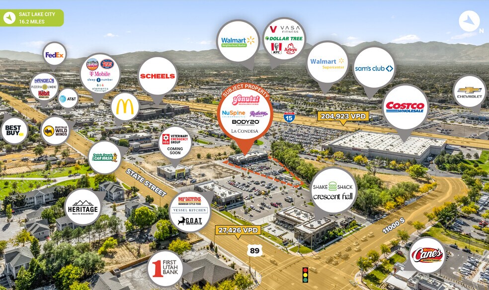 Nouveau centre de construction de bandes situé dans la banlieue aisée de Salt Lake City, à côté de Costco et de Scheels. Un centre de vente au détail à cinq locataires avec tous les locataires qui ont des baux à long terme qui comprennent des augmentations de loyer tout au long des modalités et options de base. La propriété en question est située à Sandy, en Ontario — une banlieue de Salt Lake City en pleine croissance qui bénéficie d'une excellente démographie résidentielle.
