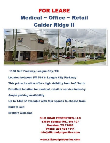 Spaces available: 2210sf & 1240sf Location: 1100 & 1108 Gulf Fwy, LEAGUE CITY TX 77573 Ample parking Located between FM 518 & League City Parkway This Prime location offers high visibility from I-45 S Excellent Location for medical, office or retail