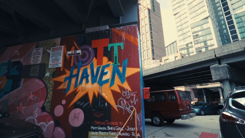 Coin de Bruckner Boulevard et Brown Place à Mott Haven, Bronx. VOISINS incluent : Amaxx Auto Sales • Shell • Dunkin’ • Storage Post • Doreen Car Wash • Mobil • Advantage True Value • V-Dogg Tattoos • Albama Auto Center